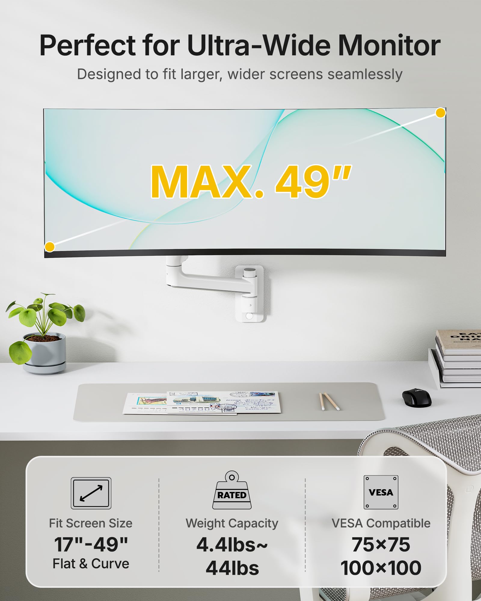 monTEK 17-49 inch Single Monitor Wall Mount for up to 44 lbs Ultrawide Screen, Premium Aluminum Heavy Duty Monitor Arm with Adjustable Gas Spring Arm, 75x75/100x100 VESA Mount, White
