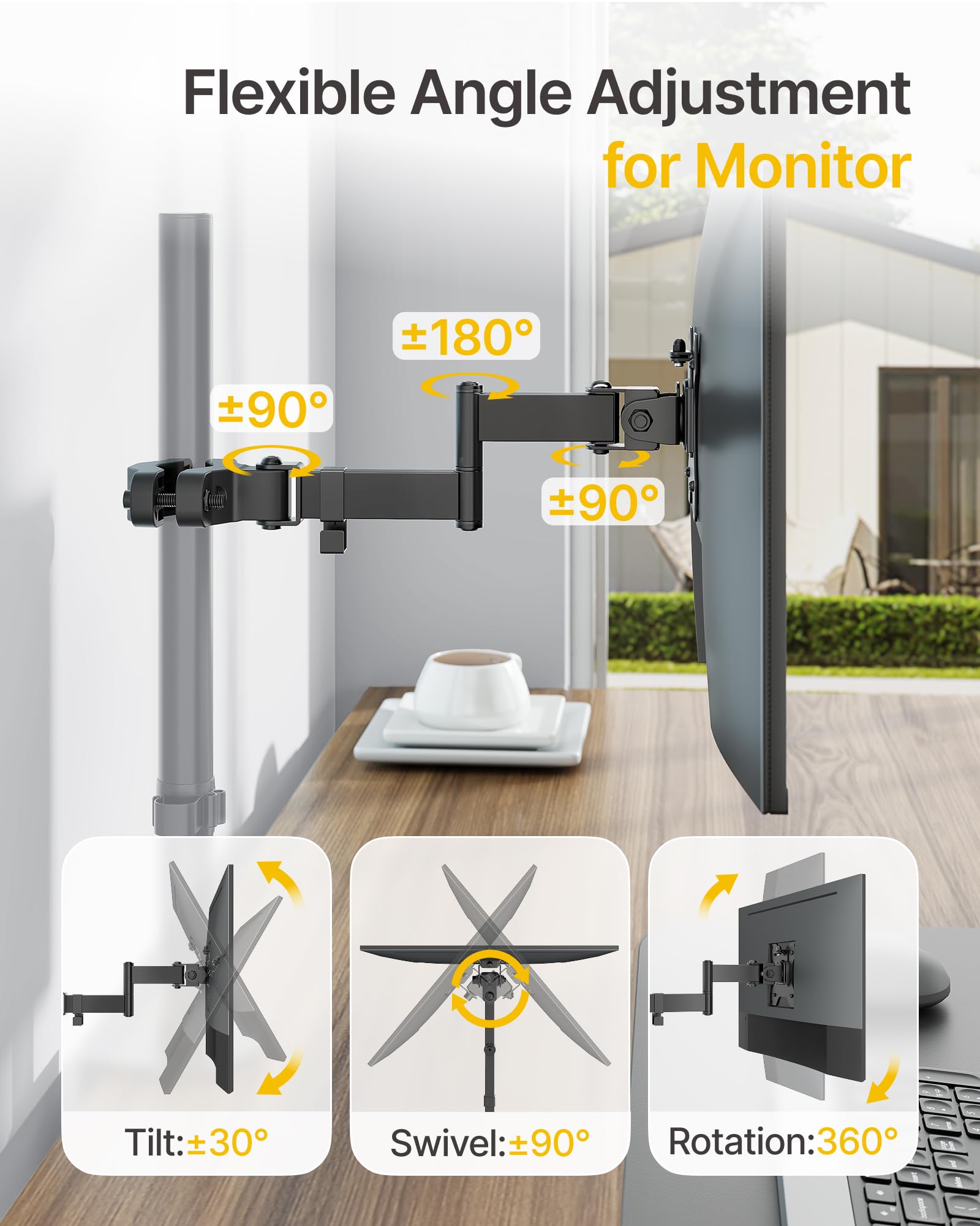 - 【Easy Installation & Excellent Customer Service】Pole mount monitor arm comes with a VESA quick release plate and all hardware to make installation easier and save installation time. We also provide detailed installation videos and instructions. We have reliable customer service and free technical support, if you have any questions, please contact us, we will be happy to serve you.