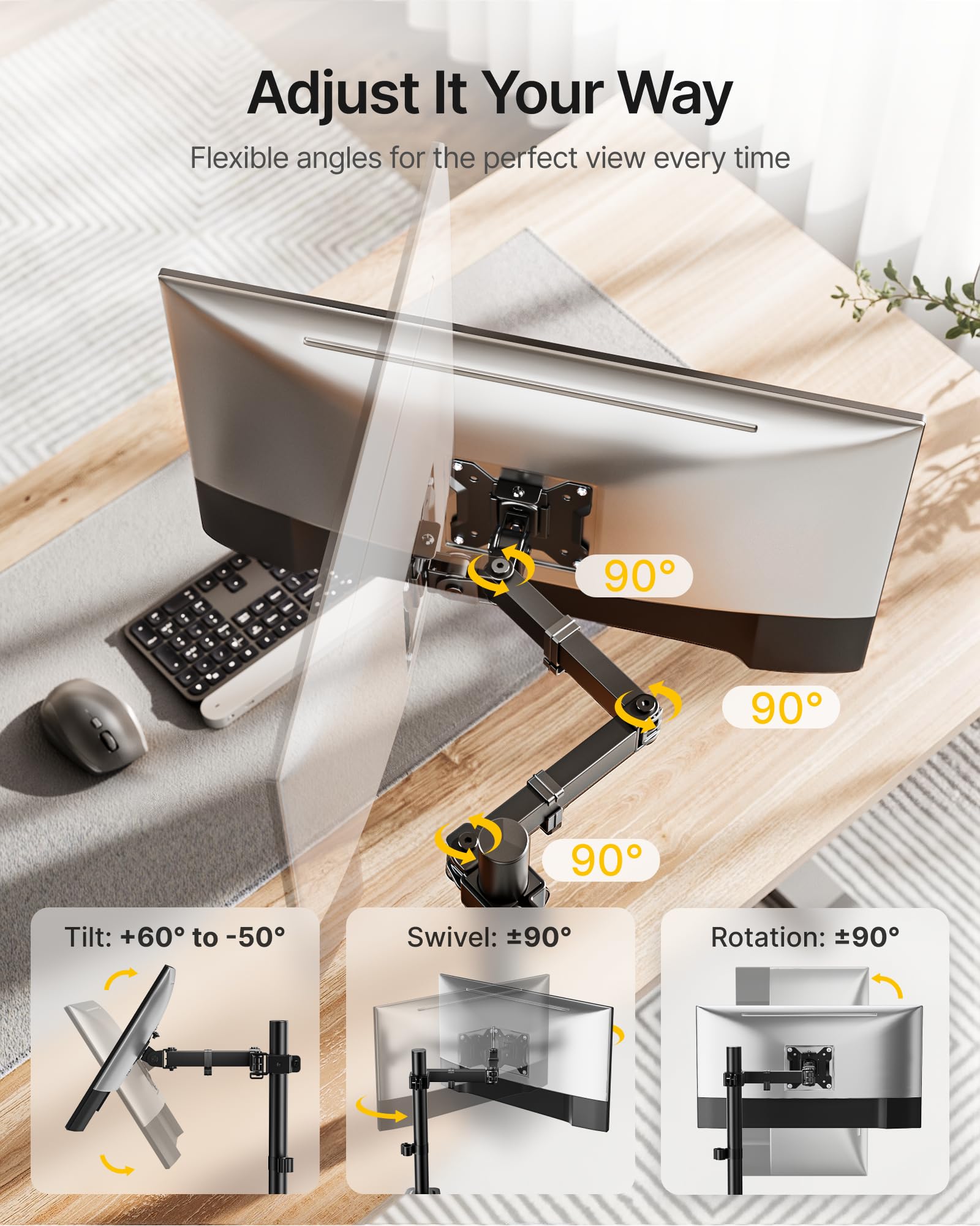 - Fully Adjustment: Our single monitor stand provides -45° to +45° tilt, -90° to +90° swivel, 360° rotation for the display, and ±90° adjustment at each joint of the stand arm. Adjust the monitor angle and choose a comfortable posture, whether you are working or playing, and say goodbye to backache and neck strain.