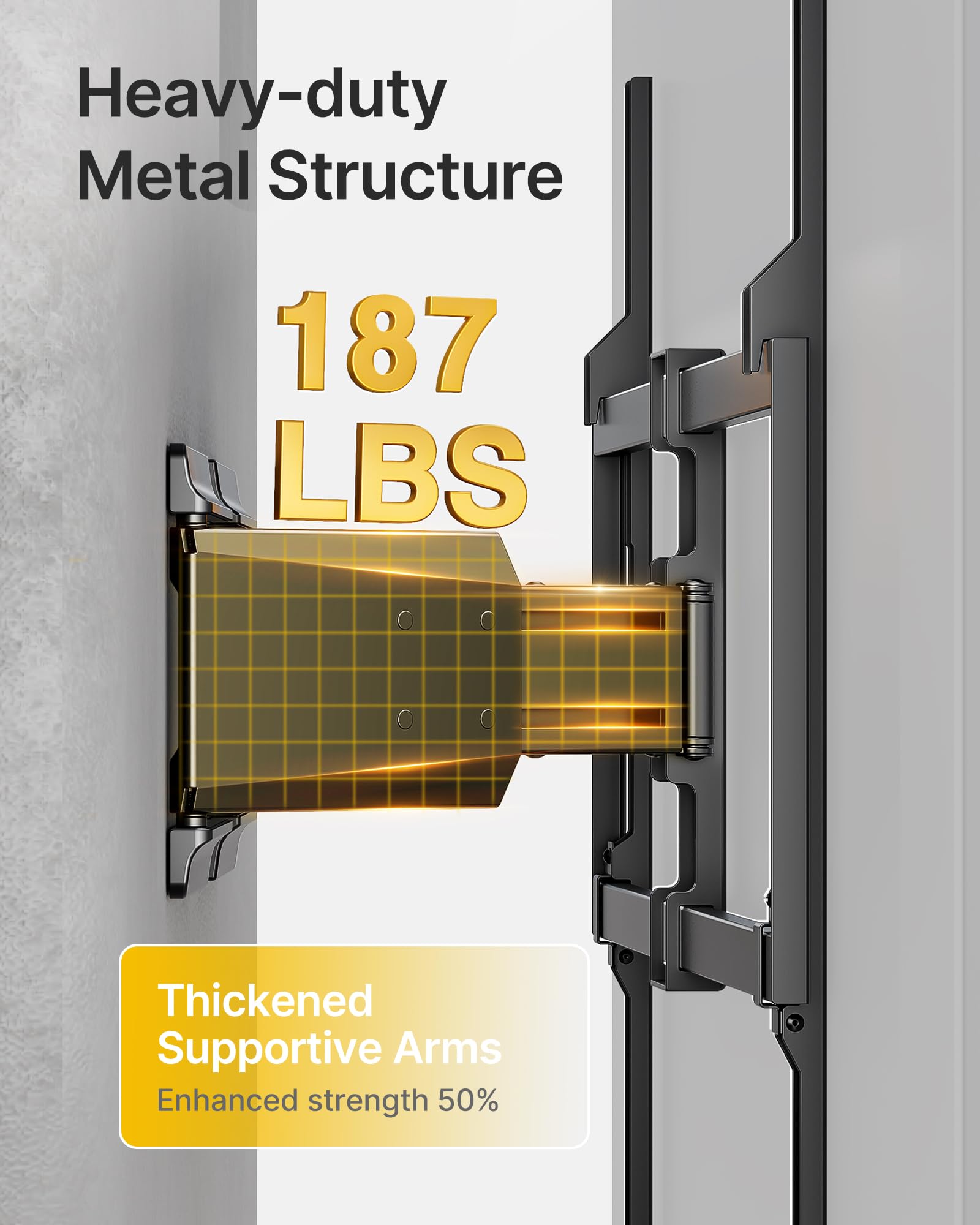 - 185LBS High Strength & 4X Weight Tested & Unique Decorative Coverļ¼monTEK tv wall mount features thickened articulating dual arms that can support up to 185 lbs. TV wall mount made of heavy-duty steel and rigorously tested to four times its maximum load, the arms offer smooth movement with ample range of motion. The durable construction, combined with security screws and thickened articulating arms, provides unmatched strength. Plus, decorative covers hide screws for an elegant look.