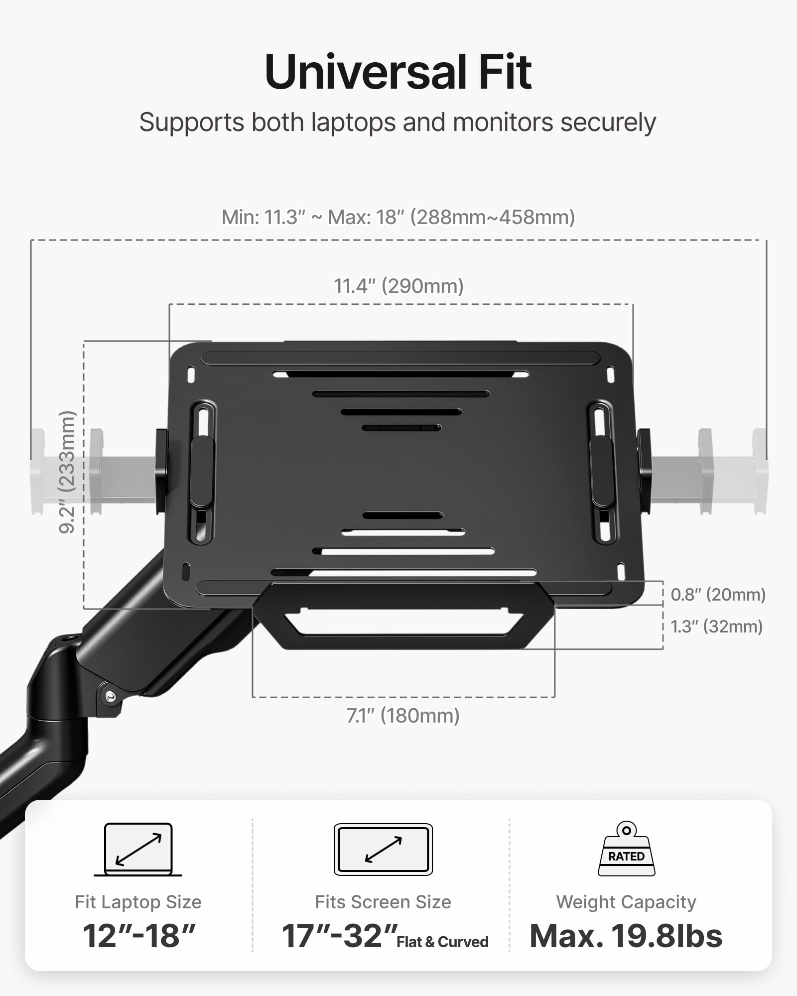 - Universal Laptop Wall Mount - Our laptop mount is made of durable steel and aluminum. It supports 12″–18″ laptops and 17″–32″ monitors, including curved screens max up to 19.8lbs/9kg. Compatible with VESA 75x75/100x100, it works with Laptop, MacBook, and Chromebook, providing a versatile solution for your workspace