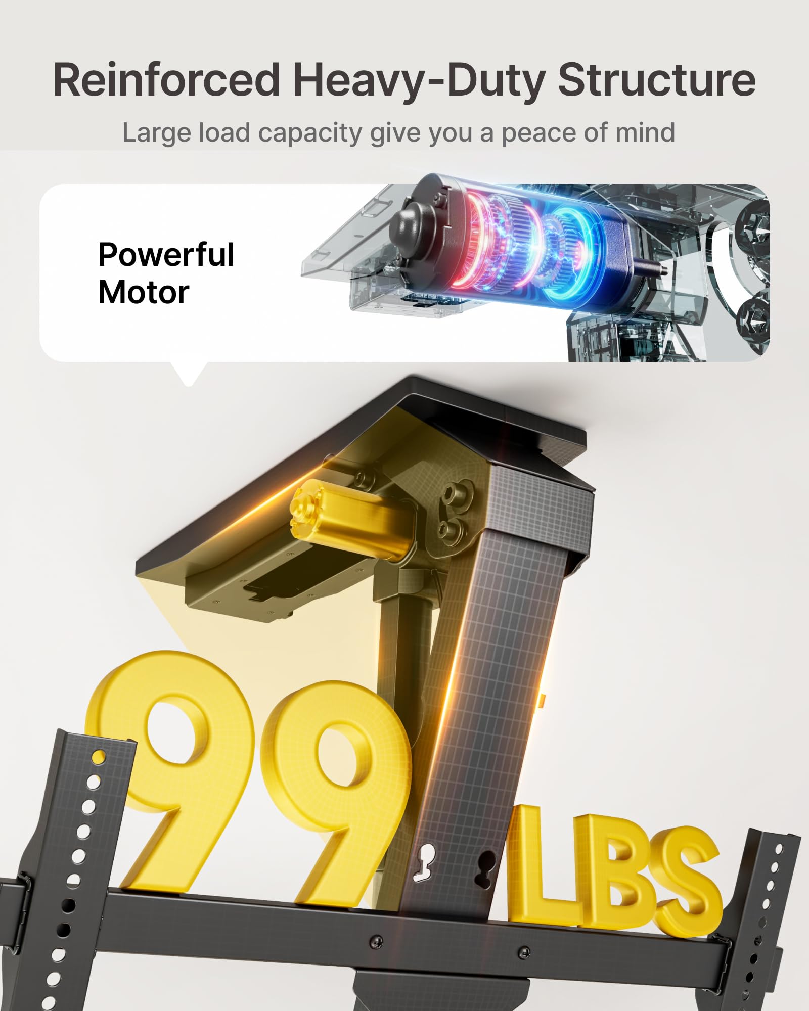 - 99LBS High Strength(4X Weight Tested!!!) & 20,000 Extension Cycles Tested!!! - Engineered for safety and strength, this sturdy motorized tv mount built with a powerful, upgraded motor for reliable performance and securely holds TVs weighing up to 99 lbs. monTEK motorized tv mount with remote installs seamlessly on flat or sloped concrete, brick, and wood ceilings. Note: Not for wood studs.