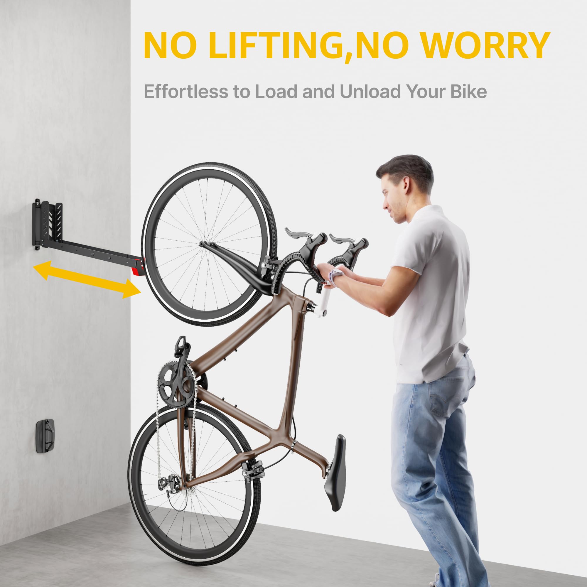 - ăNO HEAVY LIFTINGă Say goodbye to back strain and awkward bike hoisting! With monTEKâs Easy-Load Bike Wall Mount, you can simply balance your bike on the rear wheel and roll it effortlessly into placeâno heavy lifting required. When not in use, the bike rack folds flat against the wall to free up valuable space in your garage or home. Enjoy a smooth, space-saving, and effortless bike storage experience every time. Please NOTE: our no lifting bike hanger is Not compatible with bikes equipped with fenders